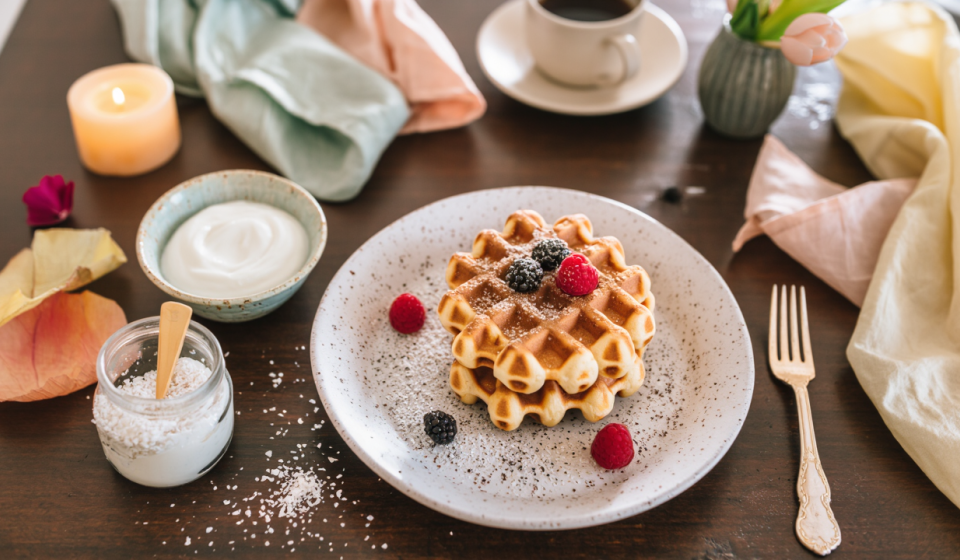 Die Waffeln schmecken pur oder mit Toppings wie frischen Beeren, Ahornsirup, Kokosjoghurt, Nussmus oder veganer Schokocreme.
