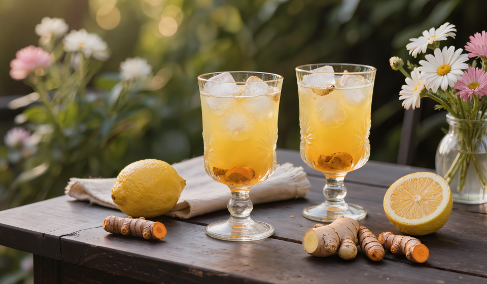 Zitronensaft, Kurkuma und Ingwer in einem Krug oder großen Glas gründlich verrühren.