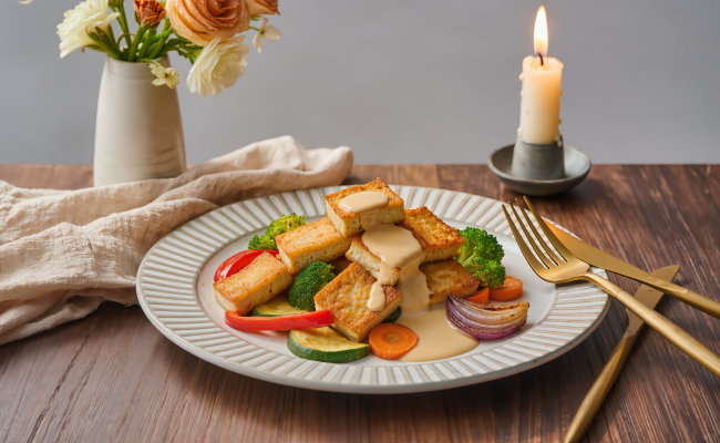 Tofu-Filet à la Bordelaise mit Zitronen-Senf-Sauce (vegan)