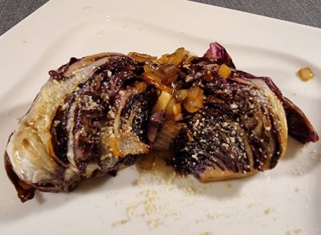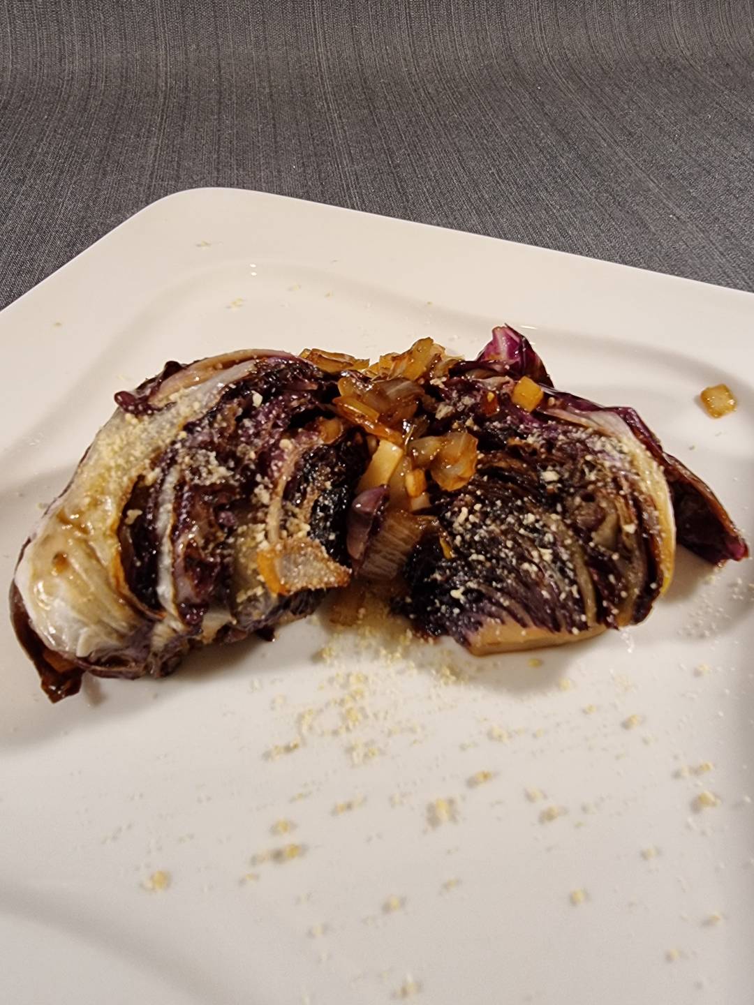 Dieses schnelle Rezept kombiniert das leicht bittere Aroma des Radicchios mit einem würzigen Balsamico-Sud, der Süße der Zwiebeln, Knoblauch und einem Hauch von veganem Parmesan.