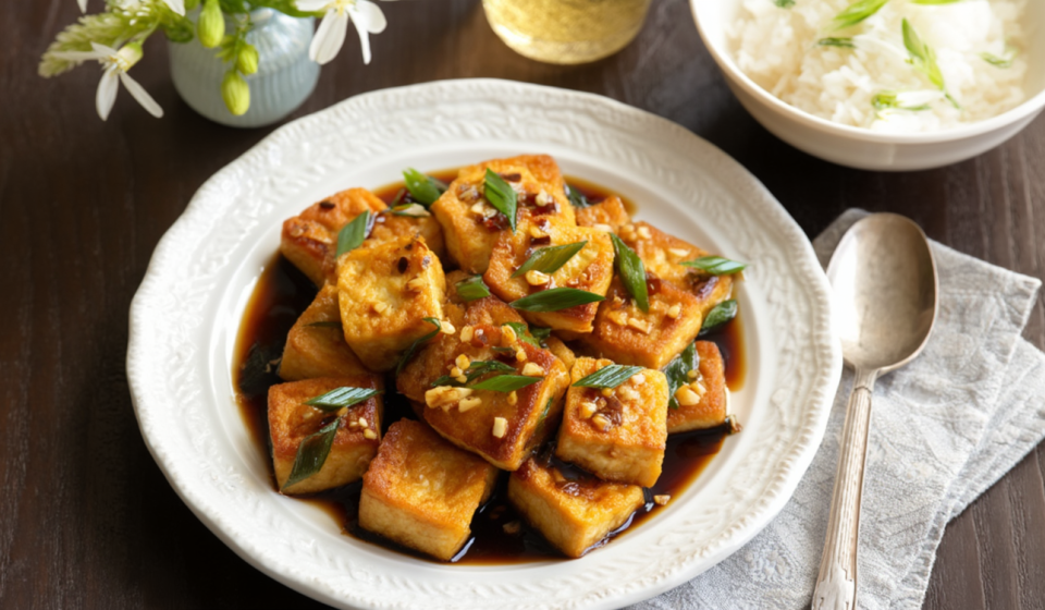 Knusprig gebratener Tofu mit Ingwer, Knoblauch & Sojasauce (vegan)