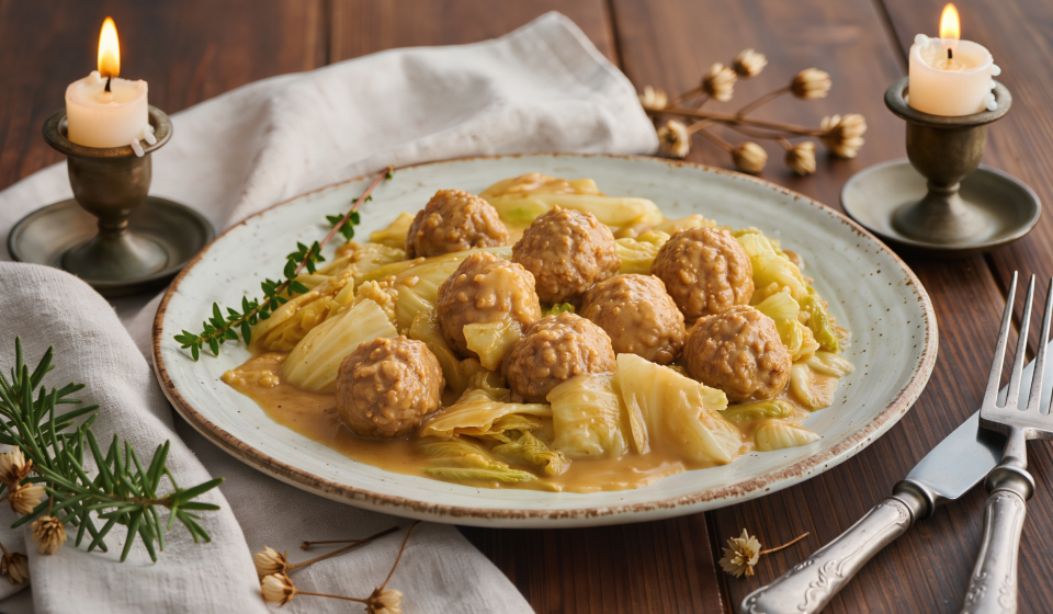 Die gebratenen Hackbällchen samt Bratfett zum Schmorkraut geben, vorsichtig unterrühren und alles zusammen weitere 5 Minuten köcheln lassen. Abschmecken und servieren.