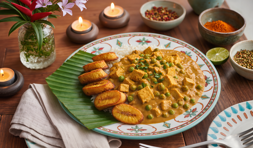 Tofu-Curry von der Gewürzinsel Grenada mit gebratenen Bananen