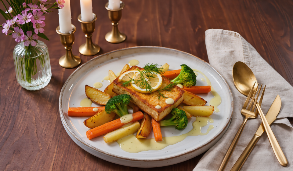 Veganen Lachs mit frischem Dill und Zitronenscheiben garnieren. Zusammen mit dem Ofengemüse und der Zitronen-Dill-Sahnesauce servieren.