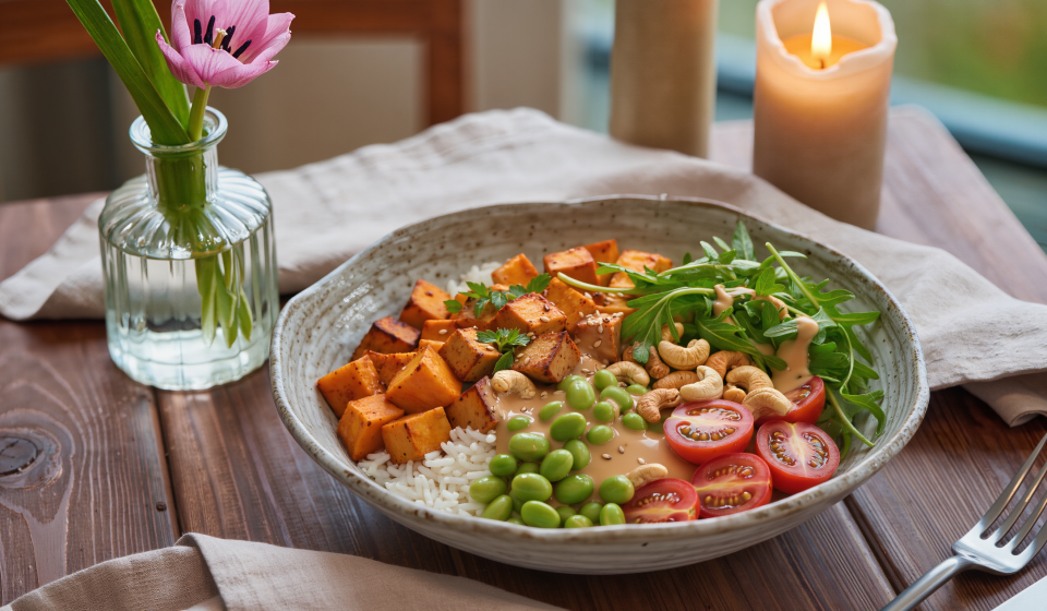 Vegane Frühlingsbowl mit Sesamdressing