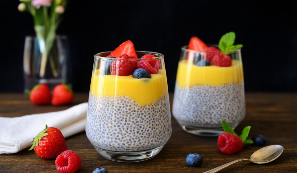 In kleine Gläser zuerst eine Schicht Chia-Pudding füllen, darauf eine Schicht Mangopüree geben und das Dessert nach Belieben mit frischen Beeren garnieren.