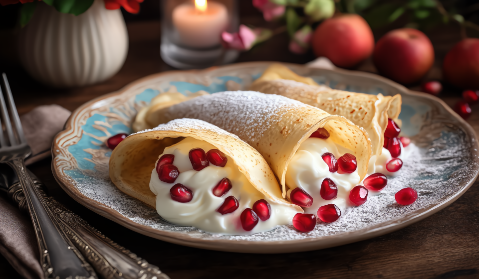 Fluffige vegane Crepes umhüllen erfrischenden Granatapfel‑Joghurt – ein leichtes, fruchtiges Genussmoment zum Brunch oder Dessert. vegane crepes granatapfel kokosjoghurt crepes rezept vegan fruchtige crepes brunch dessert vegan granatapfel joghurtfüllung leichte vegane crepes frühstück rezept ohne ei ohne milch fluffige vegane pfannkuchen süße crepes mit fruchtfüllung
