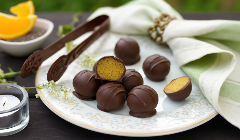 Die fest gewordenen Chia-Orangen-Pralinen aus den Förmchen lösen, in die geschmolzene Schokolade tauchen und auf einem Abtropfgitter platzieren.