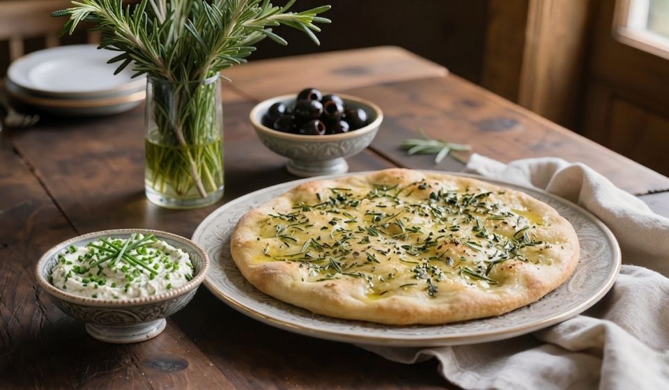 Mix the vegan cream cheese with fresh chives. Either spread it directly onto the warm focaccia or serve it as a dip on the side.