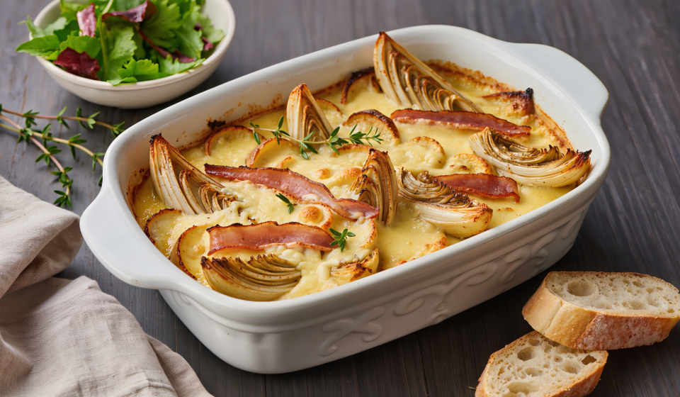 Spread the potato rosemary cream into a baking dish. Press chicory halves cut-side down into the sauce. Distribute tofu on top and between. Sprinkle with vegan shredded cheese.